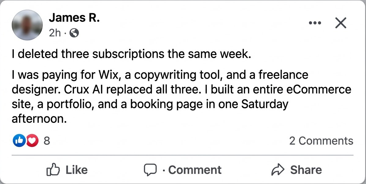 - Goodbye $200/month software stacks. Crux AI replaces your page builder, your copywriter, your hosting, and your designer. One tool. One payment. Done.