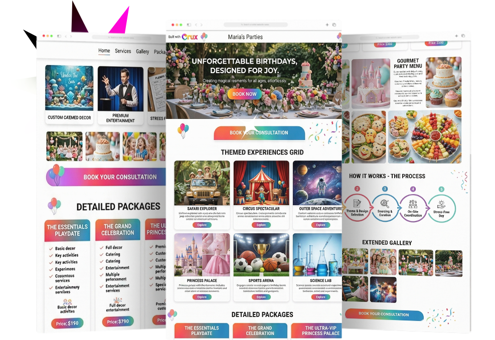 The next morning, Maria opened Crux AI and typed: "Build a website for a kids' birthday party planning business. Fun colors. Services page, gallery, booking form, about us."