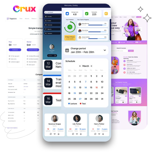 Student dashboards, lesson layouts, pricing tables, enrollment pages. Kajabi charges $149/month. Teachable takes a cut of your sales. Thinkific upsells you on every feature. Or — you build your own platform with Crux AI. Branded. Yours. No revenue sharing. No monthly drain.