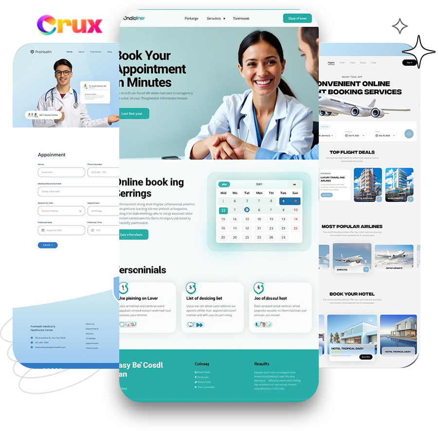 Therapists, photographers, consultants, salons — anyone who books appointments needs this. Describe the business. Crux AI builds the entire scheduling site.