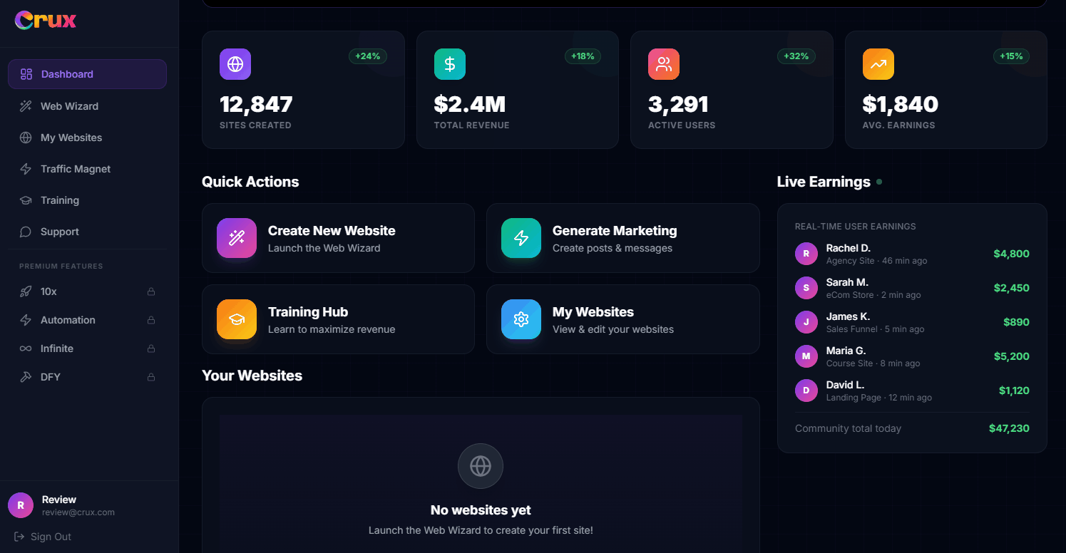 But it's not sustainable at $17. The AI costs real money to run. Every website Crux AI generates uses compute resources. At scale, the numbers don't work at this price.