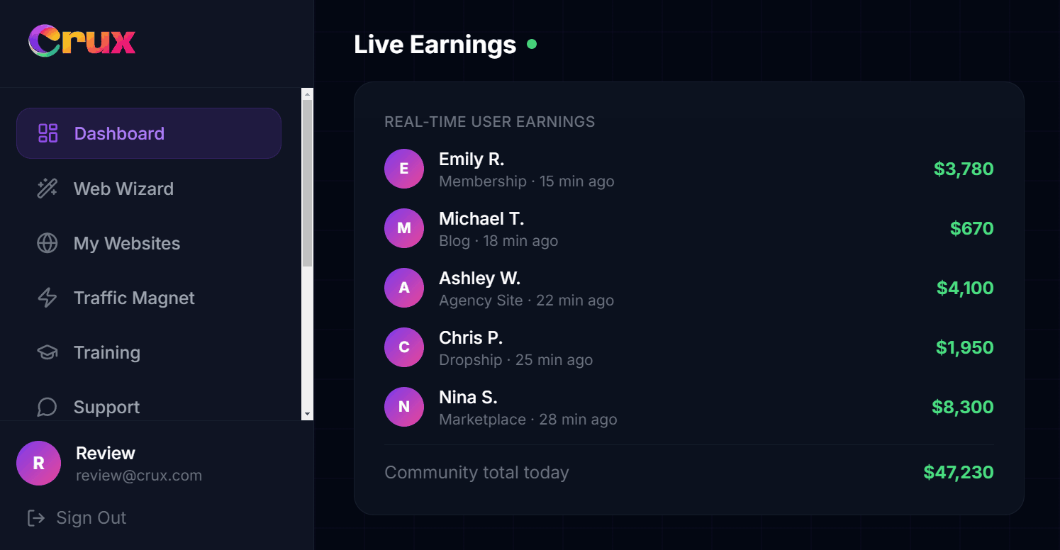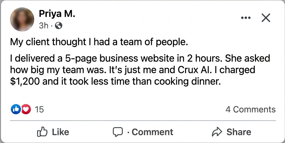 Walk in. Ask if they want a website. Type their business name into Crux AI. Show them the result on your phone. Close the deal before you leave the building. One Crux AI user built 6 sites for businesses on a single city block in one weekend. Total revenue: $4,200.