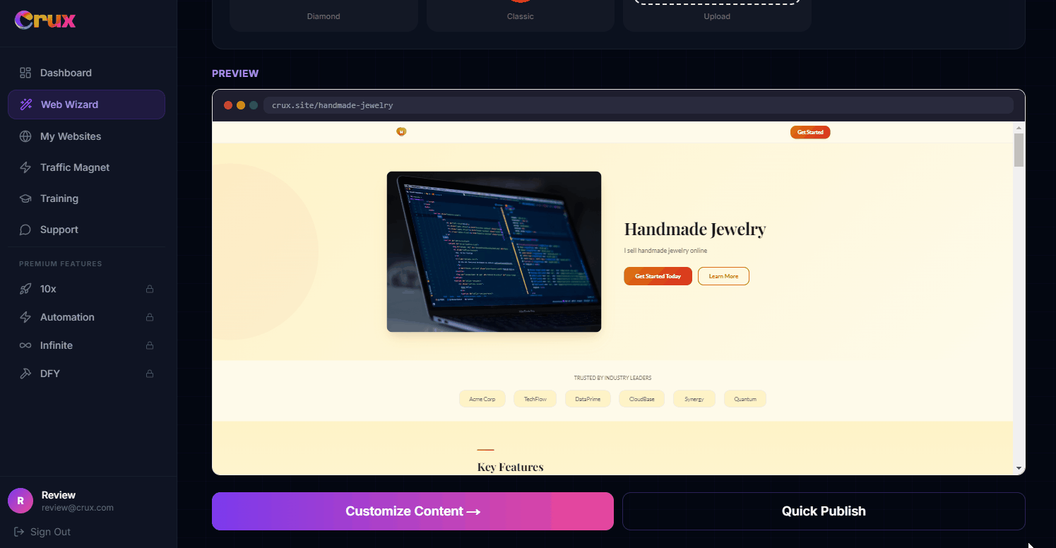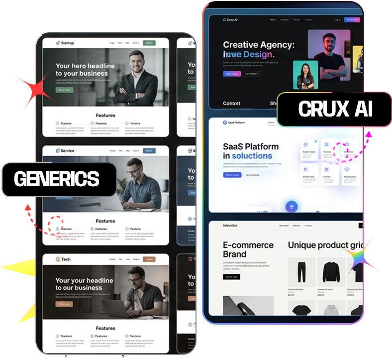 Crux AI generates entire, deployable, designed websites with written copy, responsive layouts, and one-click publishing.